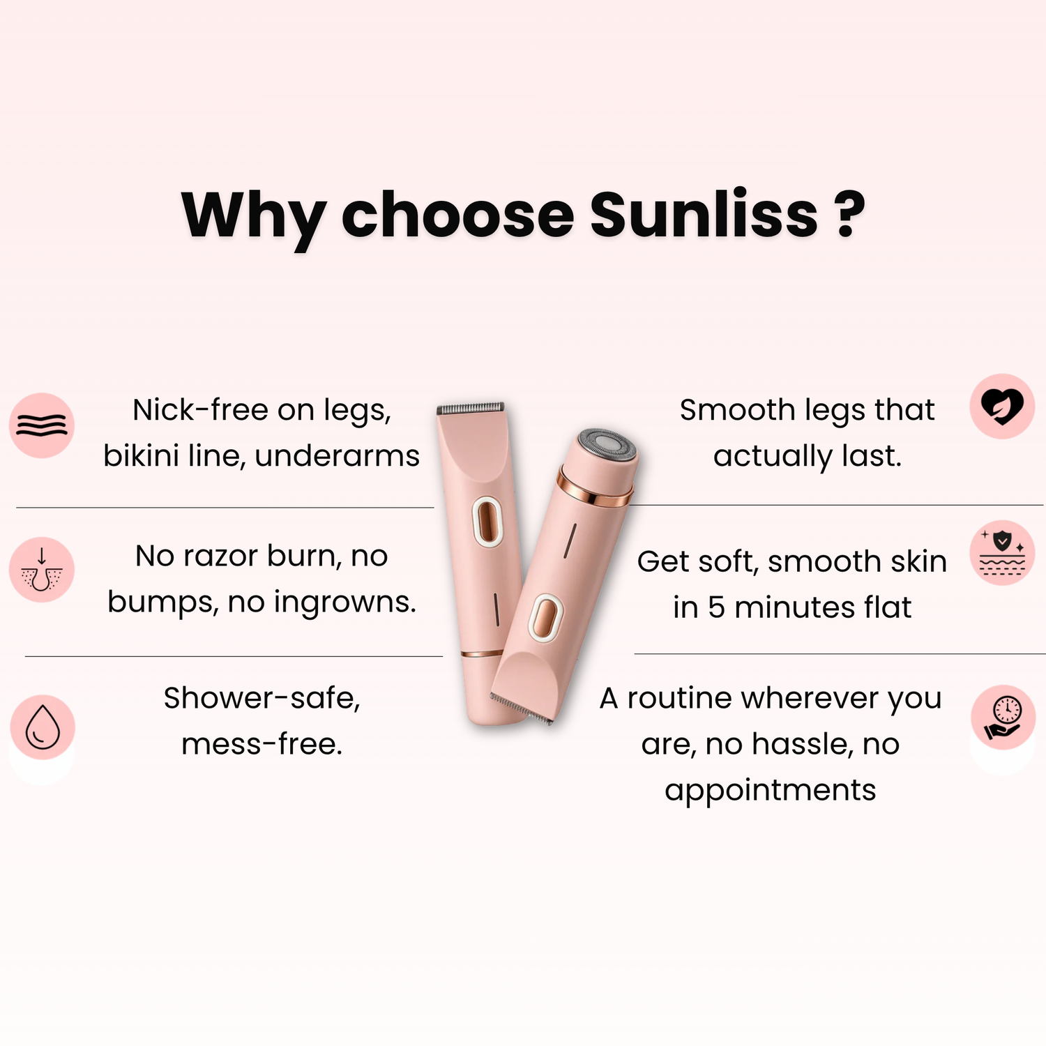 Yes. Sunliss is specially designed to be gentle on skin—even on sensitive areas like the bikini line and underarms. With its dual trimmer + shaver heads, you get a smooth result without irritation or redness.