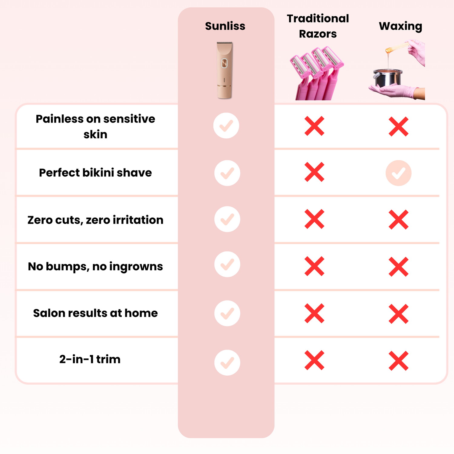 Thanks to its innovative design, Sunliss removes hair with minimal skin contact, helping reduce the risk of nicks and ingrowns.